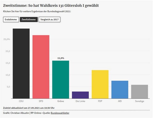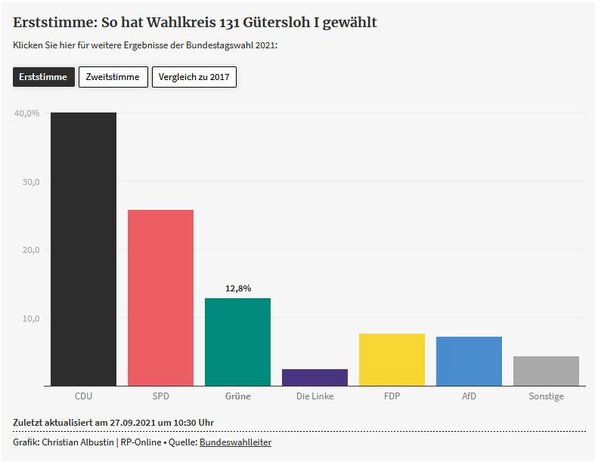 Bei der Bundestagswahl konnten wir ebenfalls ein Zeichen setzen. Eine künftige Regierung wird wohl nicht ohne die Beteiligung der Grünen Bundestagsfraktion zustande kommen. Die 14,8% stellen eine deutliche Steigerung von 5,9 Prozentpunkten dar und zeigen, dass die Themen Umwelt- und Klimaschutz, Mobilitäts- und Energiewende immer mehr an Bedeutung gewinnen. Dabei liegt unser Wahlkreis Gütersloh I mit 15,9% sogar über dem Ergebnis der Bundestagswahl. Auch hierfür danken wir den fleißigen Wahlhelfern im ganzen Kreis.