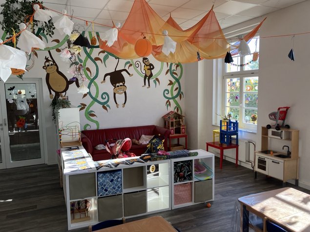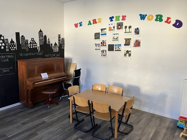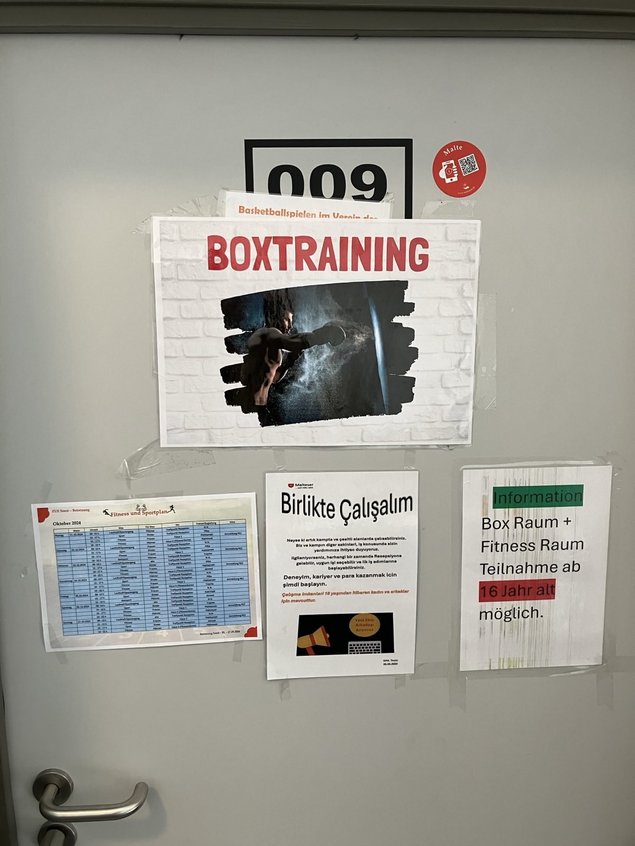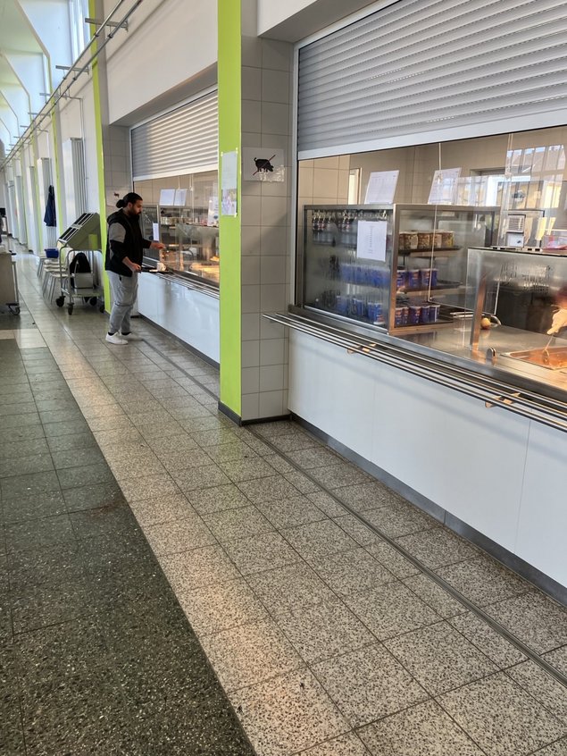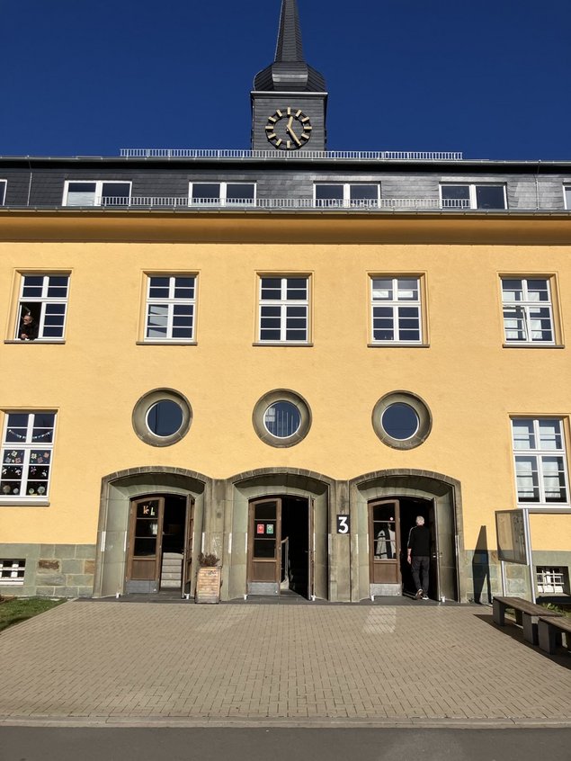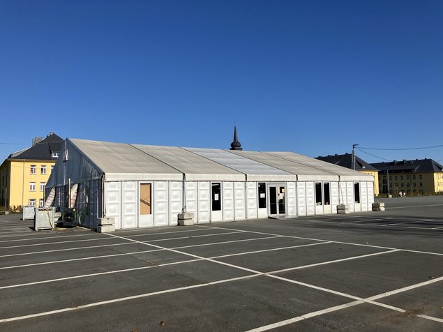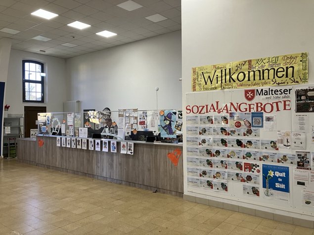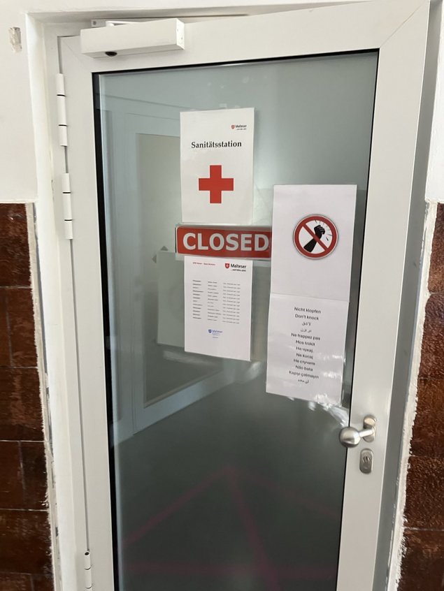 Im Anschluß konnten wir die Kindertagesstätte, die Krankenstation, Sporträume, die Kantine mit Rezeption und Informationspinnwänden, und zuletzt den Hof mit dem letzten großen Zelt, das jetzt nur noch für Freizeitangeboten benutzt wird.