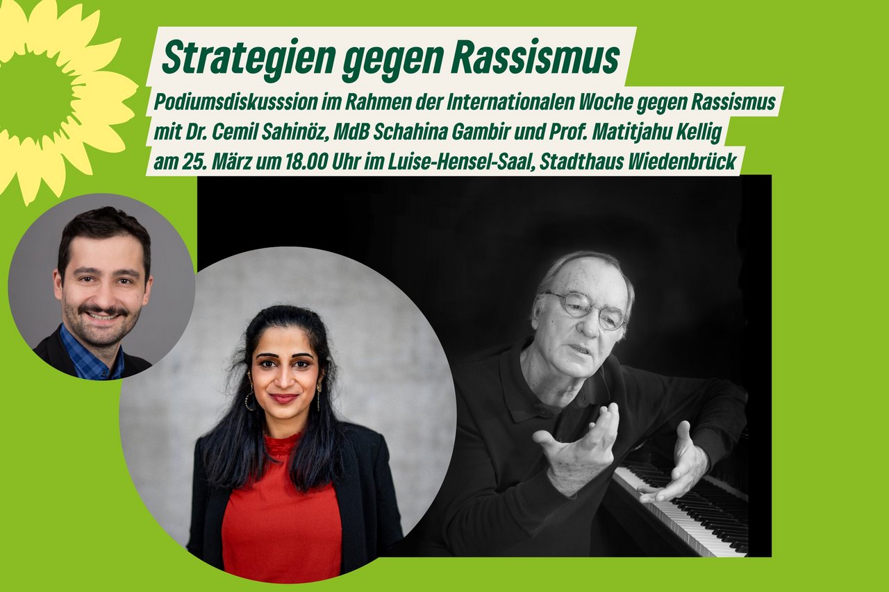 Zur Internationalen Woche gegen Rassismus kommt unsere Grünen Bundestagsabgeordnete Schahina Gambir, Obfrau der Enquete Kommission zu Afghanistan, wieder nach Rheda-Wiedenbrück. Sie nimmt an einer Podiumsdiskussion zum Thema Strategien gegen Rassismus teil, zusammen mit Matitjahu Kellig, emeritierter Professor und Konzertpianist, Vorsitzender der jüdischen Gemeinde Herford-Detmold und Initiator des Vereins Toleranztunnel, und Cemil Sahinöz, Integrationsberater beim DRK Kreis Gütersloh, Diplom Soziologe und Dr. der Theologie. Die Veranstaltung am Montagabend, 25. März um 18.00 Uhr im Luise-Hensel-Saal wird ergänzt durch eine Fotoausstellung des Jugendforums Rheda-Wiedenbrück im Foyer des Stadthauses.