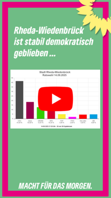 Mit einem Ergebnis von 13 % konnten wir ein Resultat erzielen, das unsere Erwartungen übertroffen hat. Dieses starke Votum zeigt, dass die Themen, die wir in den Mittelpunkt gestellt haben – Klimaschutz, nachhaltige Stadtentwicklung und soziale Gerechtigkeit – für viele Bürger:innen in Rheda-Wiedenbrück von großer Bedeutung sind.